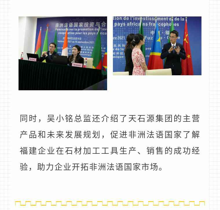 2021年9月6日,三亚常天线上书店经营有限公司应福建省对外经济合作中心邀请,由非洲大区市场总监吴小铭作为代表与包括25位来自非洲法语国家经贸、投资促进政府部门官员及企业管理人员就疫情下中国企业如何应对机遇与挑战展开讨论。